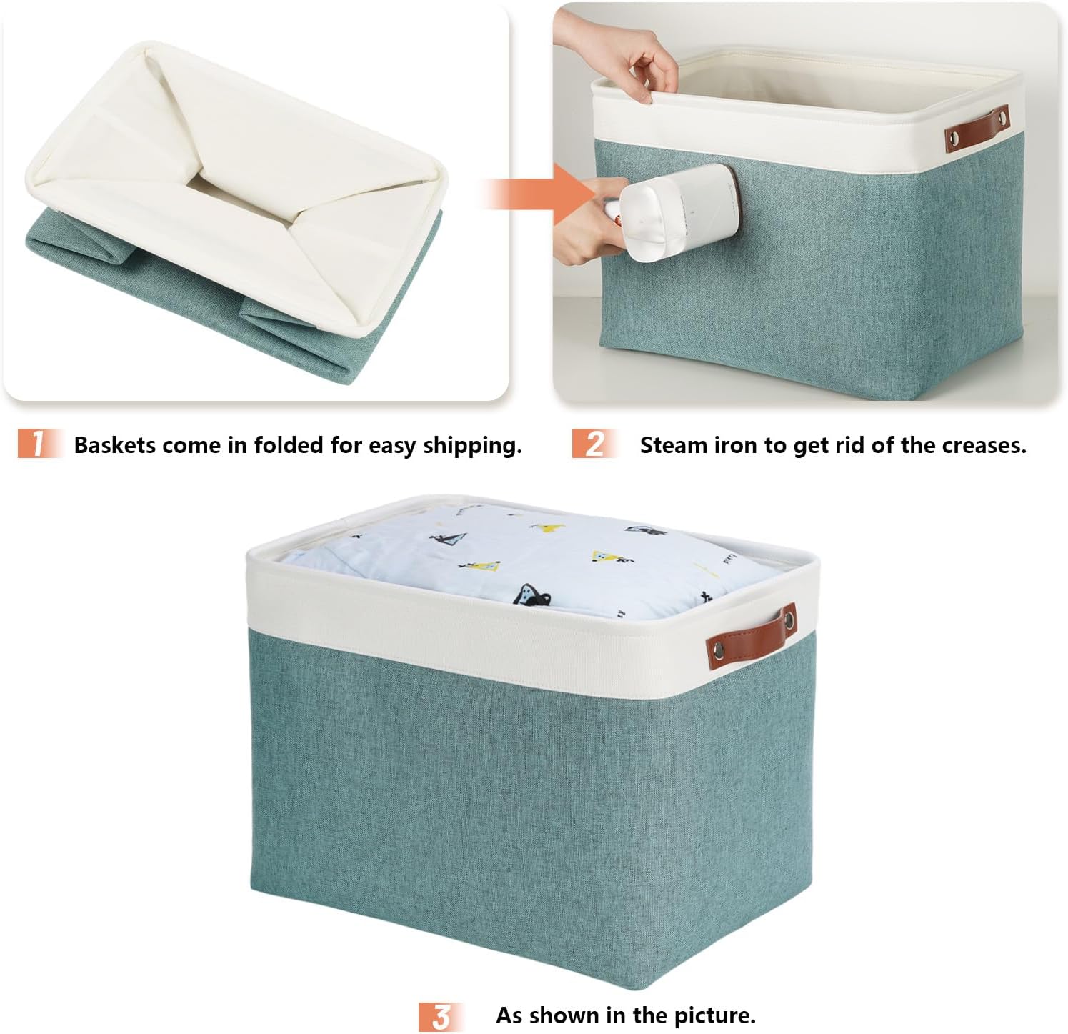 - STURDY & RESISTANT: Set of 3 , dimensions(each): 16(L) x 12(W) x 12(H) inches. Premium Materials, resistant and has no odor. The leather handles and metal iron buckles are sturdy.The sturdy handles make fabric storage baskets easy to carry or pull off and out of shelves.