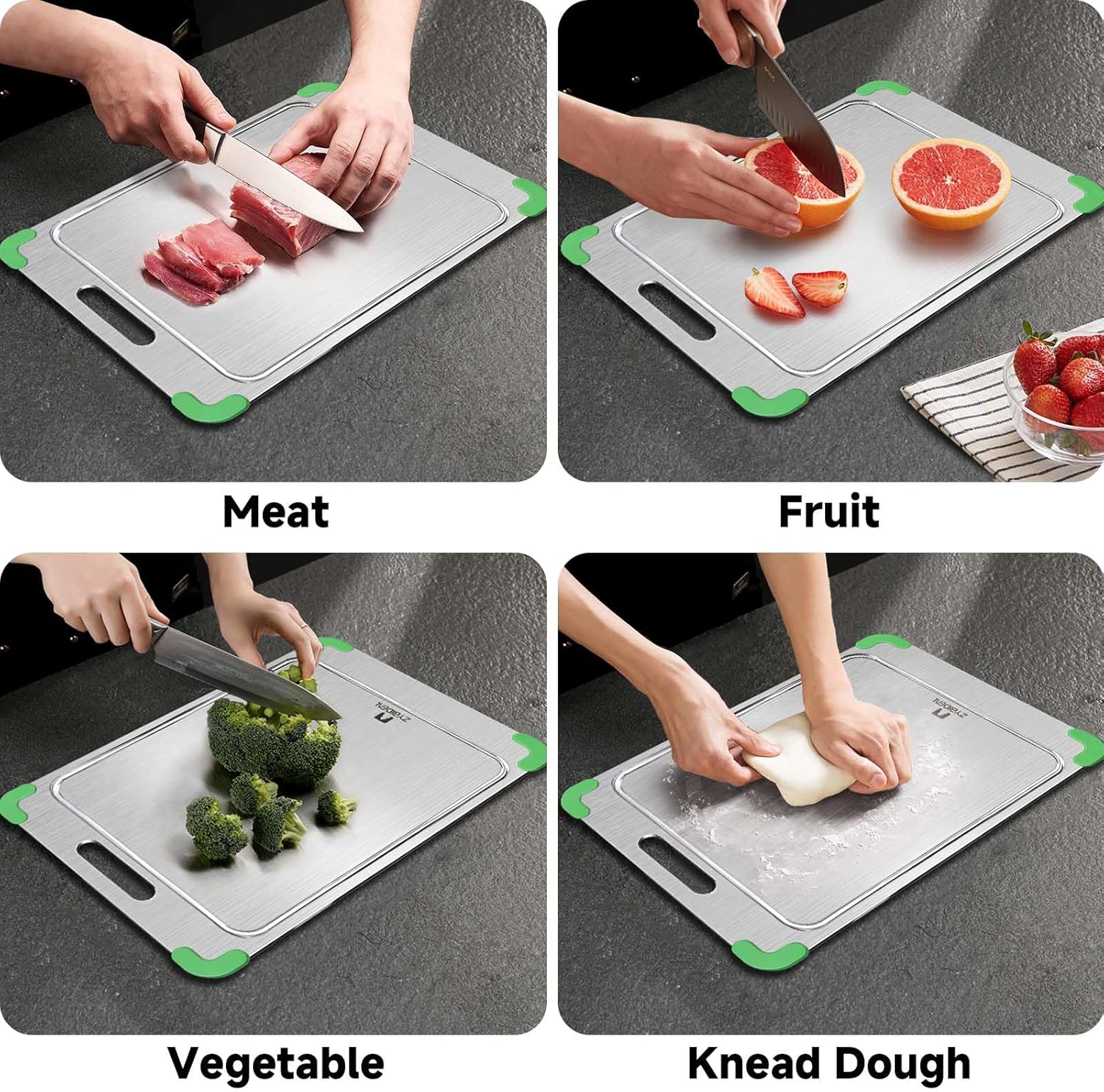 100% Pure Titanium Cutting Board with Grooves, Update Double Side Titanium Chopping Board, Silicone Anti-slip Stainless Cutting Boards for Kitchen 8 * 12 IN, Green