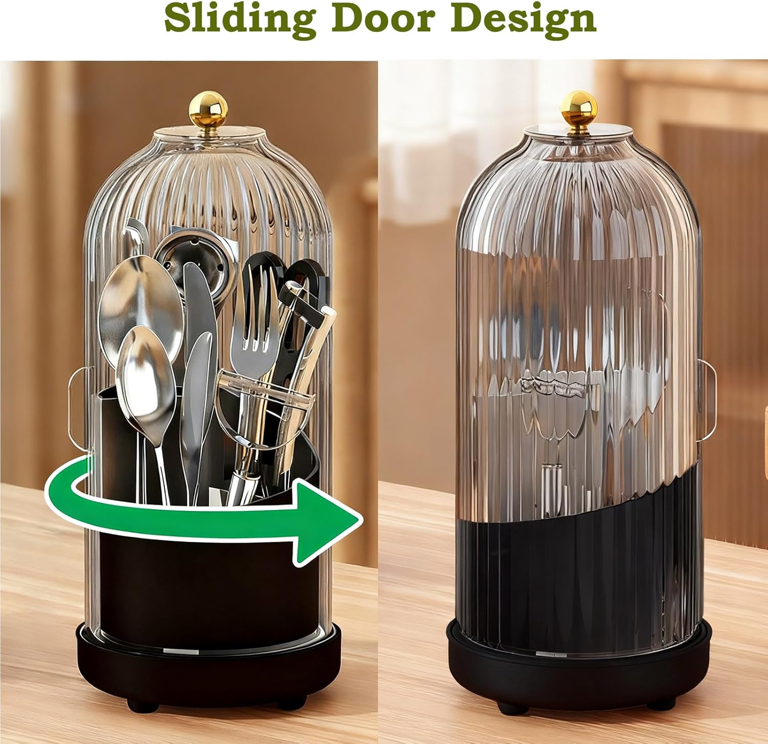 JEESA Utensil Holder with Lid, 360° Rotating Flatware Organizer for Cutlery Spoon Fork(H Less 8"), Silverware Caddy Organizer Drainage Dustproof Flatware Holder Kitchen Countertop Storage, Black