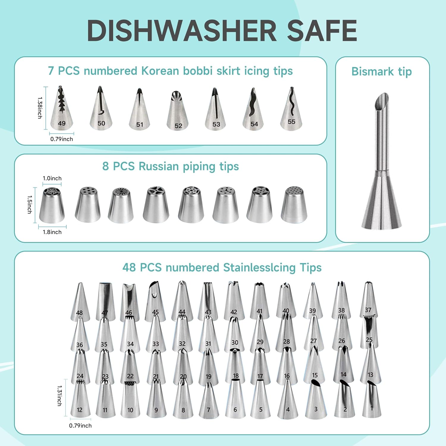 - Piping Bags and Tips Set: Includes 64 numbered icing piping tips, 30 disposable & 2 reusable 12” frosting pasty bags. Allow you to create a variety of designs, including simple dots and lines as well as intricate flowers and leaves. The included coupler makes changing tips on your piping bags a breeze without emptying the bag or creating any mess.