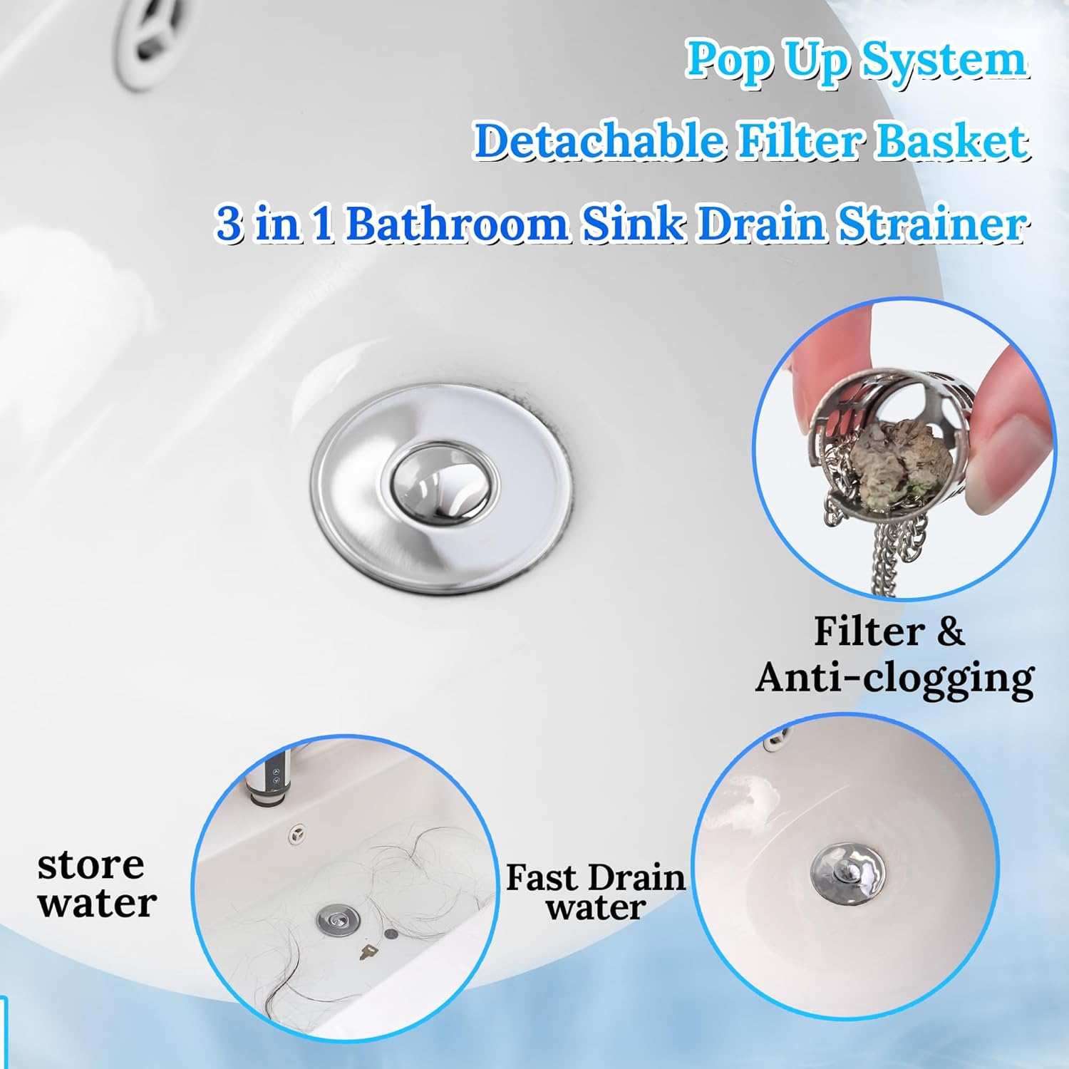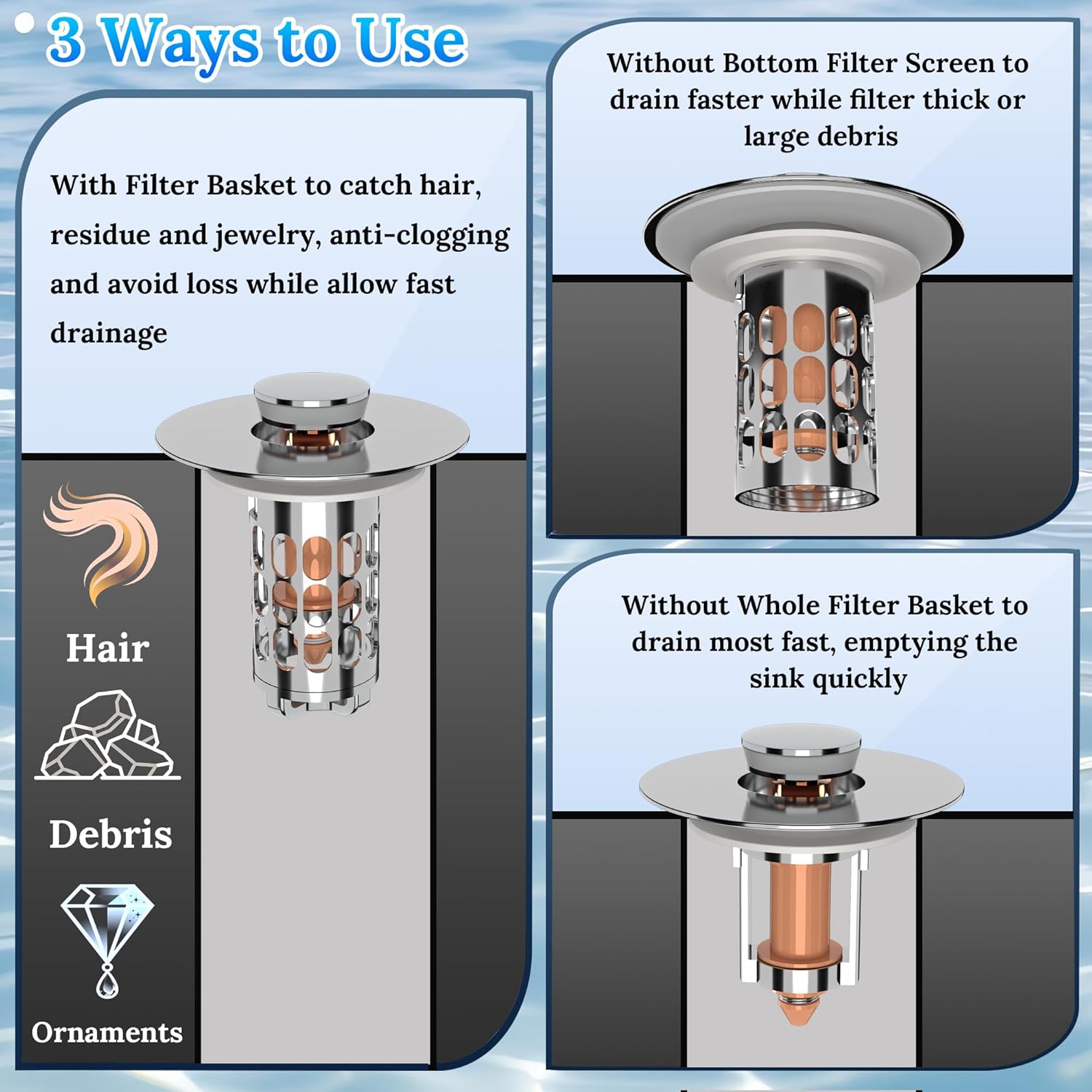 3 in 1 Bathroom Sink Drain Strainer,Universal Pop Up Bathroom Sink Stopper Hair Catcher,with Filter Basket Sealing Ring for Anti-Clogging Odor-Proof,Easy Install Drain Catcher for 1.06”~1.61” Hole