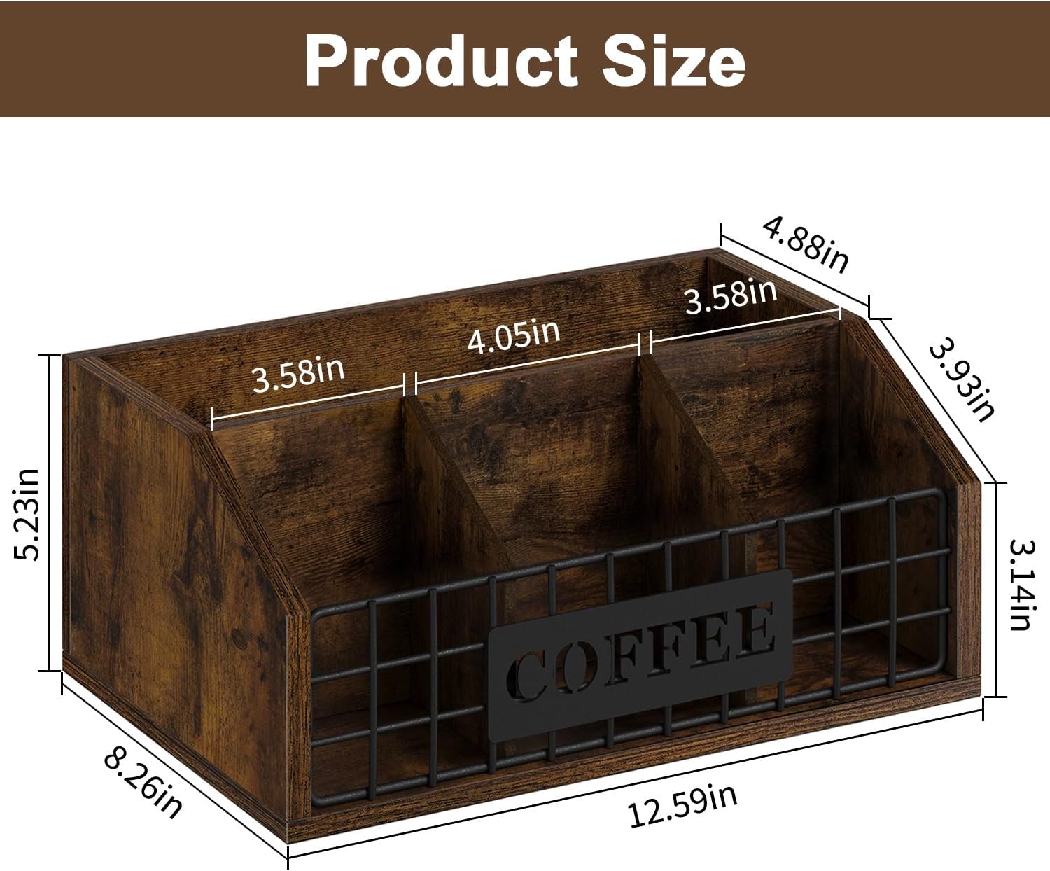 YINMIT Coffee Station Organizer for Countertop, Wood Coffee Bar Organizer with Removable Dividers for Pods, Syrup, Cups, Stirrer, Tea - Office Bar Accessories, Iron Wire-Vintage Brown