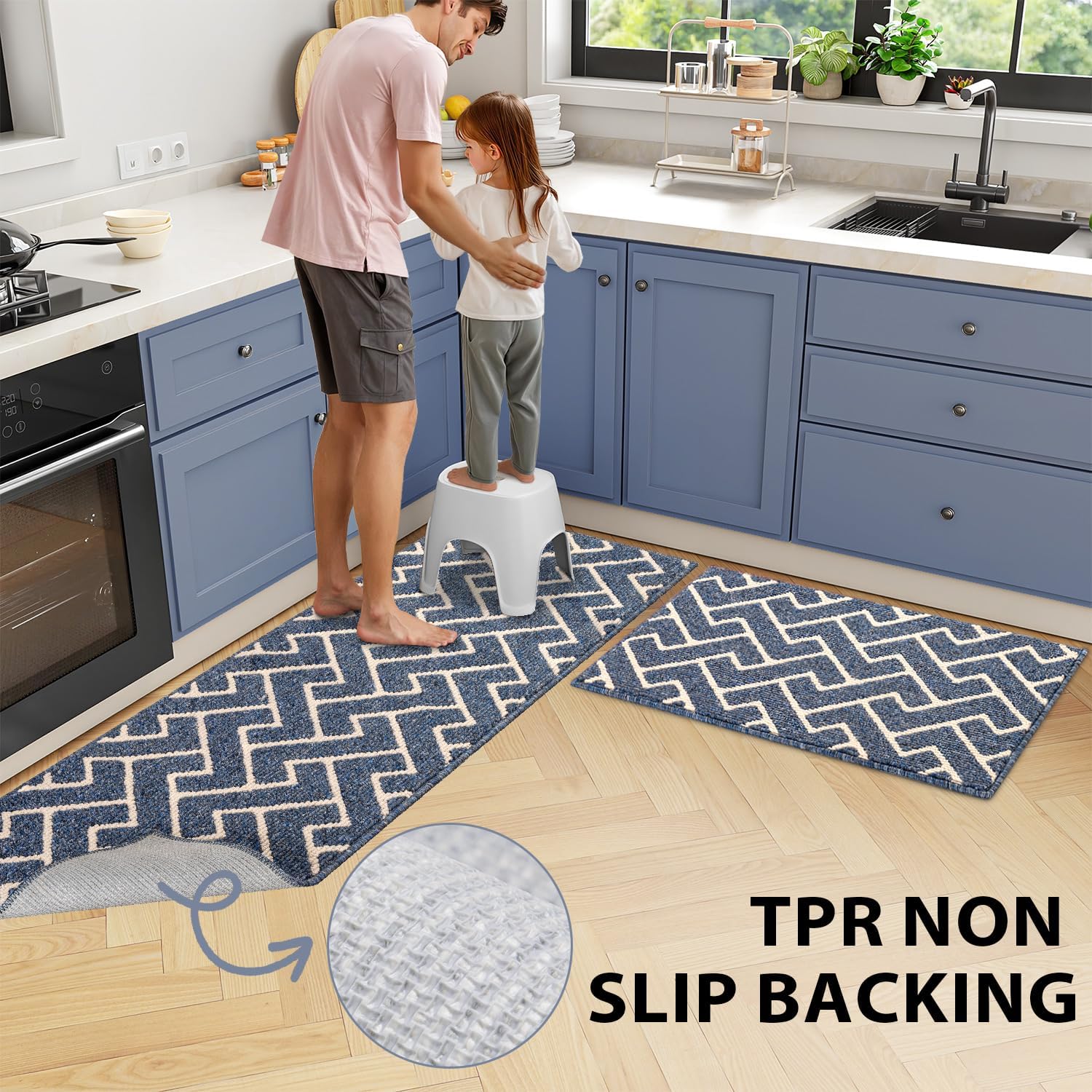 - NON-SLIP BACKING: High quality TPR backing to keep the kitchen mat firmly in place and prevent shifting and skidding. Provide better security for families with children or the elder. Attention: The kitchen rug underlay should be clean, flat, and dry before placing the mat on the floor. Water or dust under mat may cause slippage.