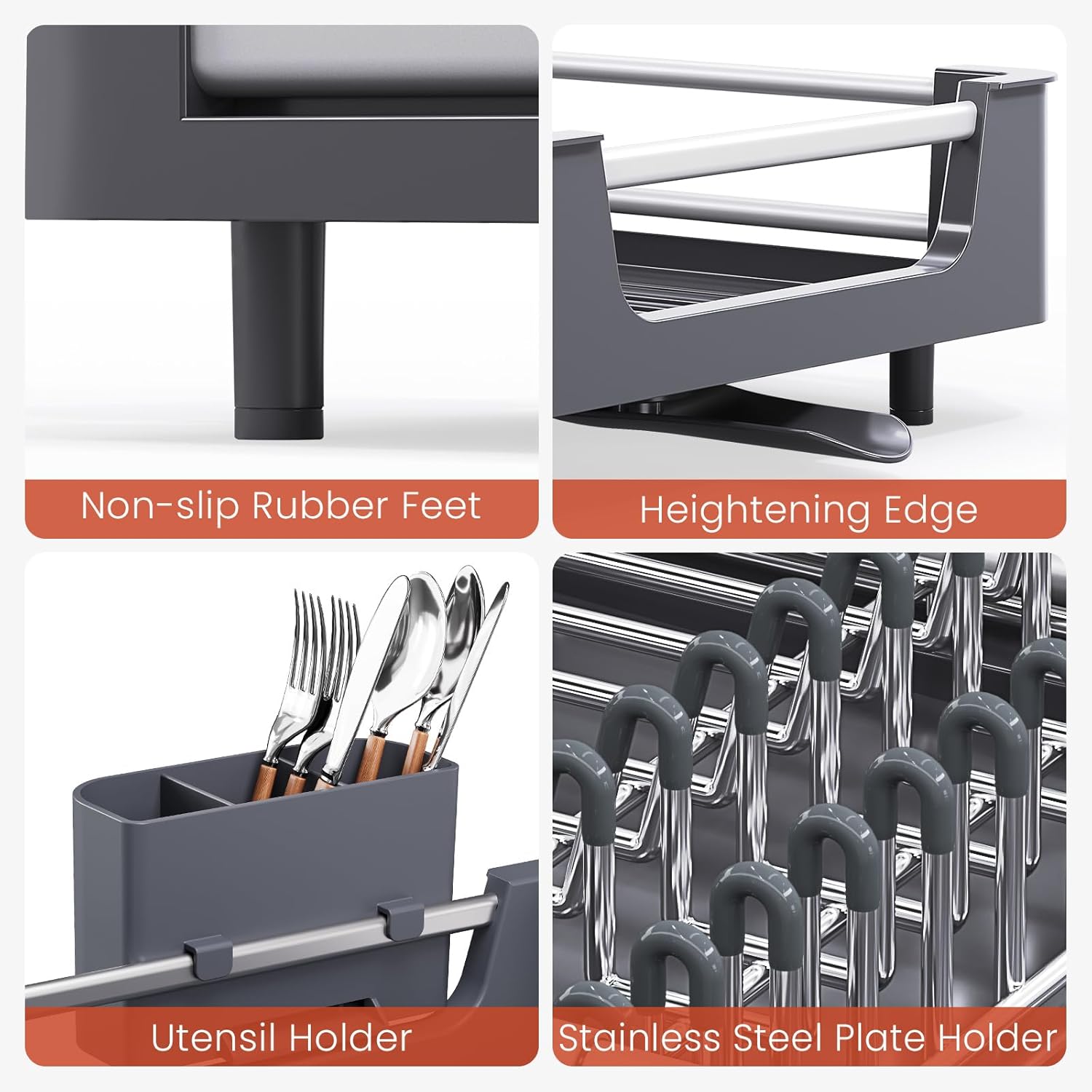 - NON-SCRATCH & NON SLIP:The plate rack is covered with the protective cover, it prevents your items from scratch, falling and reduces the appearance of noise. The non-slip rubber feet keep the stability of the whole rack and will not scratch the countertop