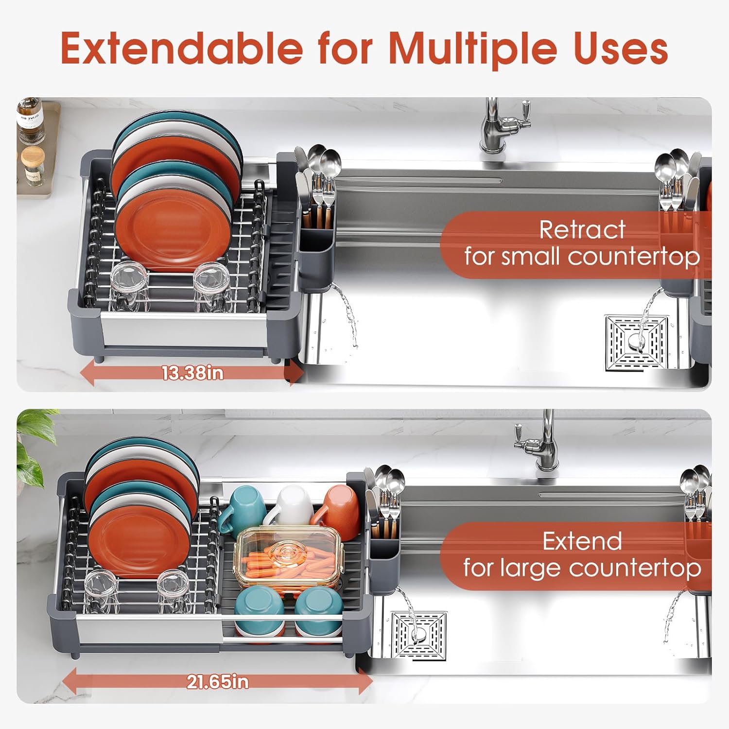 - EXTENDABLE DESIGN: The unit (not expanded) measures 13.1" L x 12.4" W x 4.33" H. The extendable design can expand to 21.2" length. It's perfect for all kinds of kitchen countertop space, no matter litmited condo or luxury kitchen