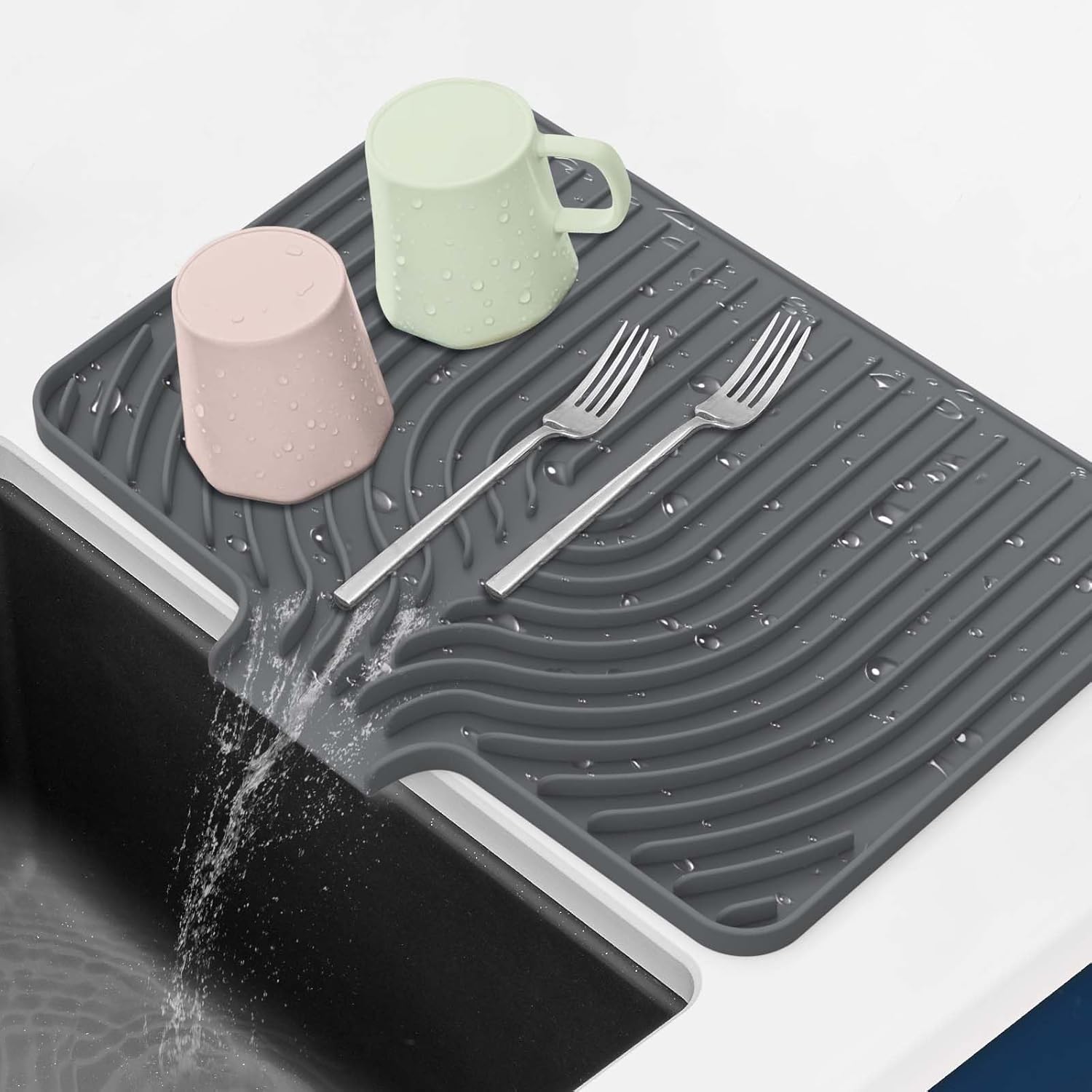 - Unique drain design: Drying matt kitchen counter work on both counter and sink. Its bottom's front is raised, fitting all sink designs like those with lips. Water gathers in the drain instead of flowing onto the counter, keeping it clean and tidy