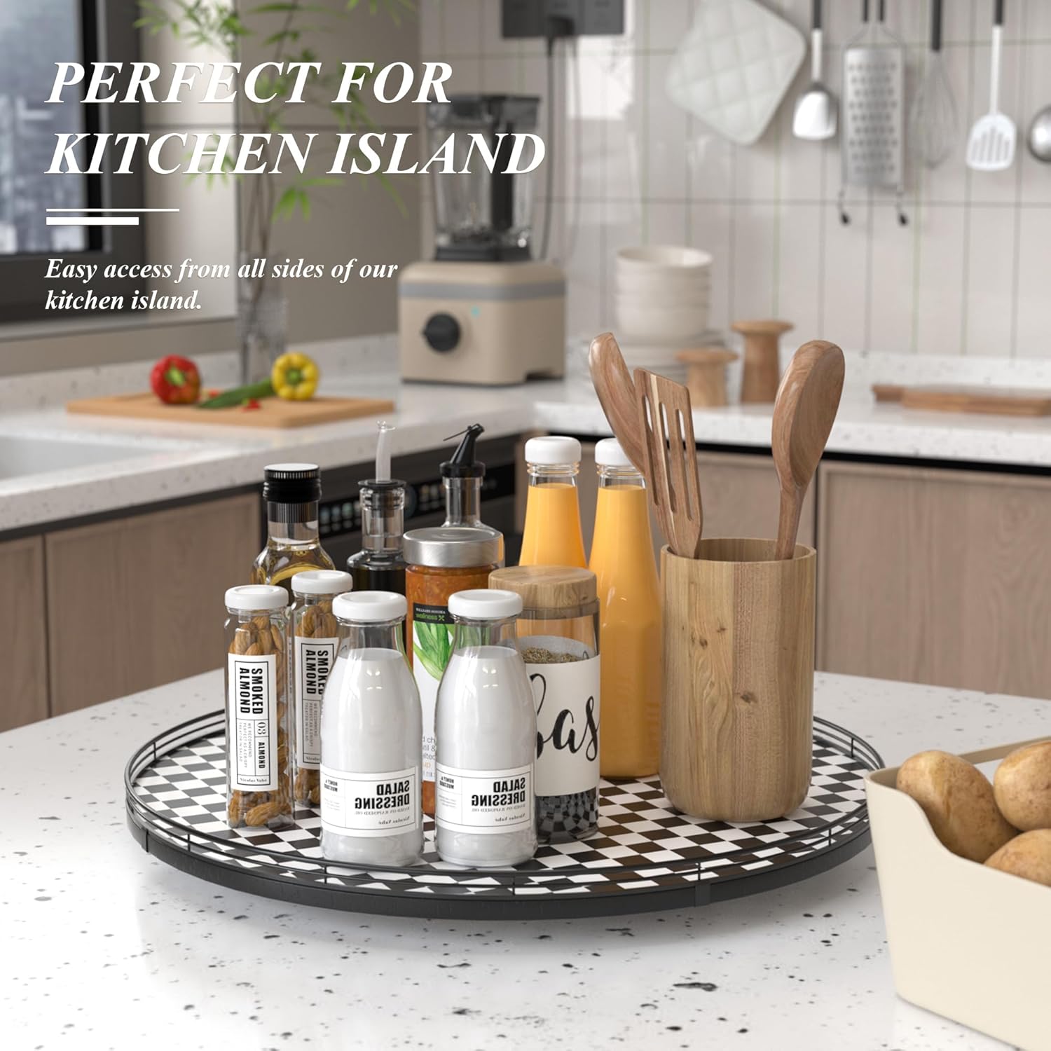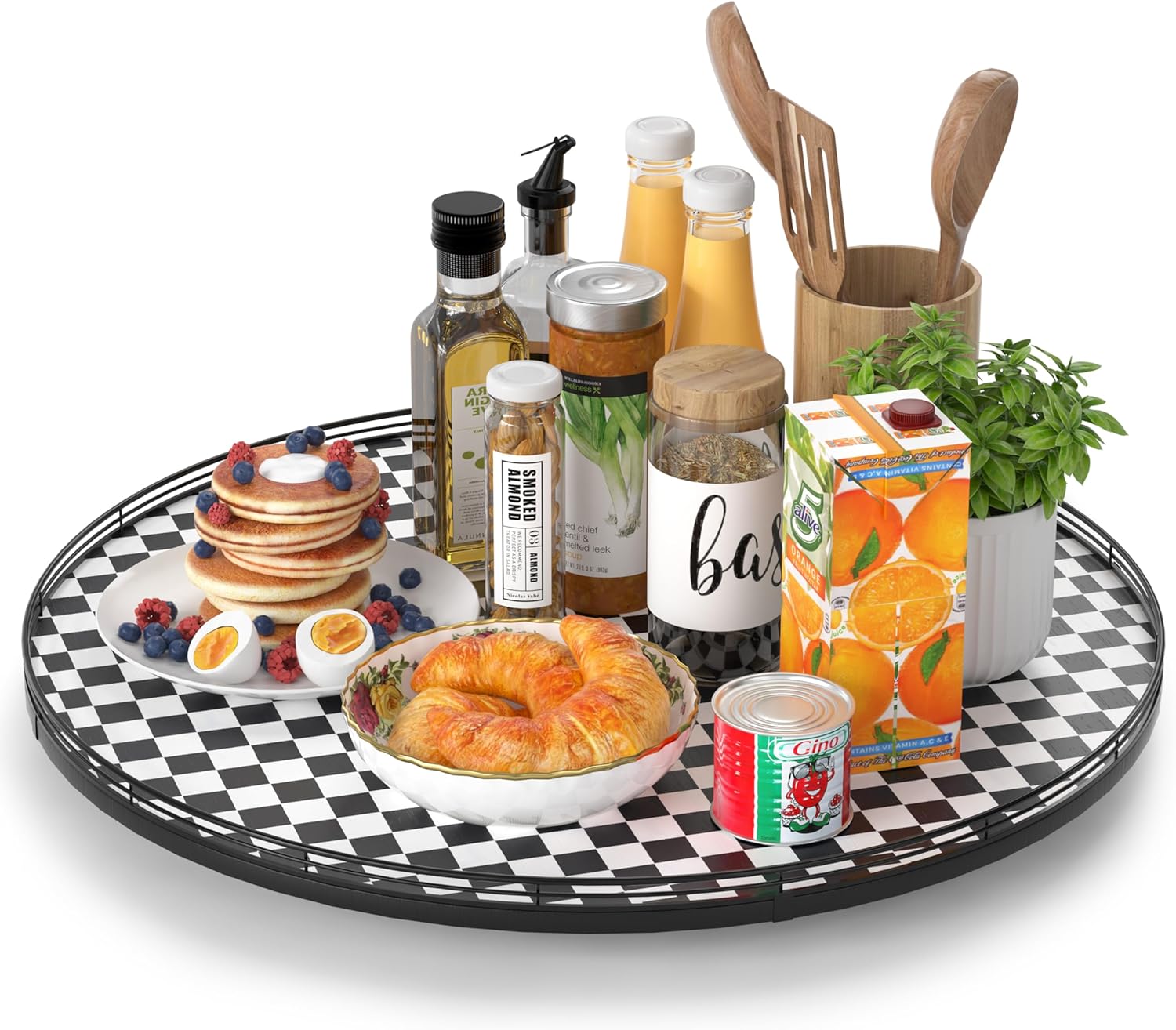 - CLASSIC BLACK AND WHITE CHECKERED DESIGN: A stylish black and white kitchen decoration plate with a sturdy iron frame, seamlessly blending with your black and white kitchen things to elevate your home decor. Perfect as a large decorative lazy Susan, a kitchen table centerpiece, or a table kitchen caddy, bringing both function and charm to your tabletop.