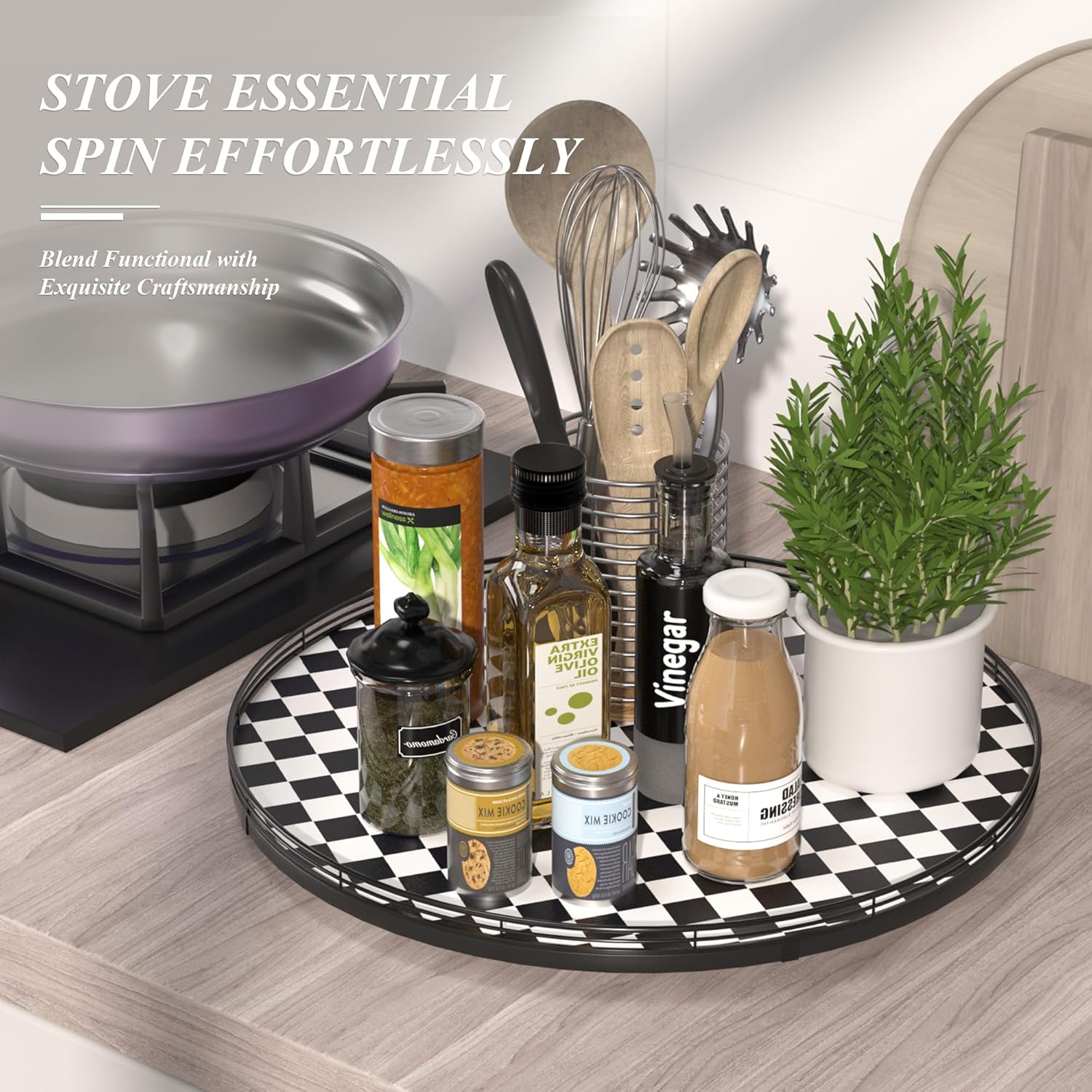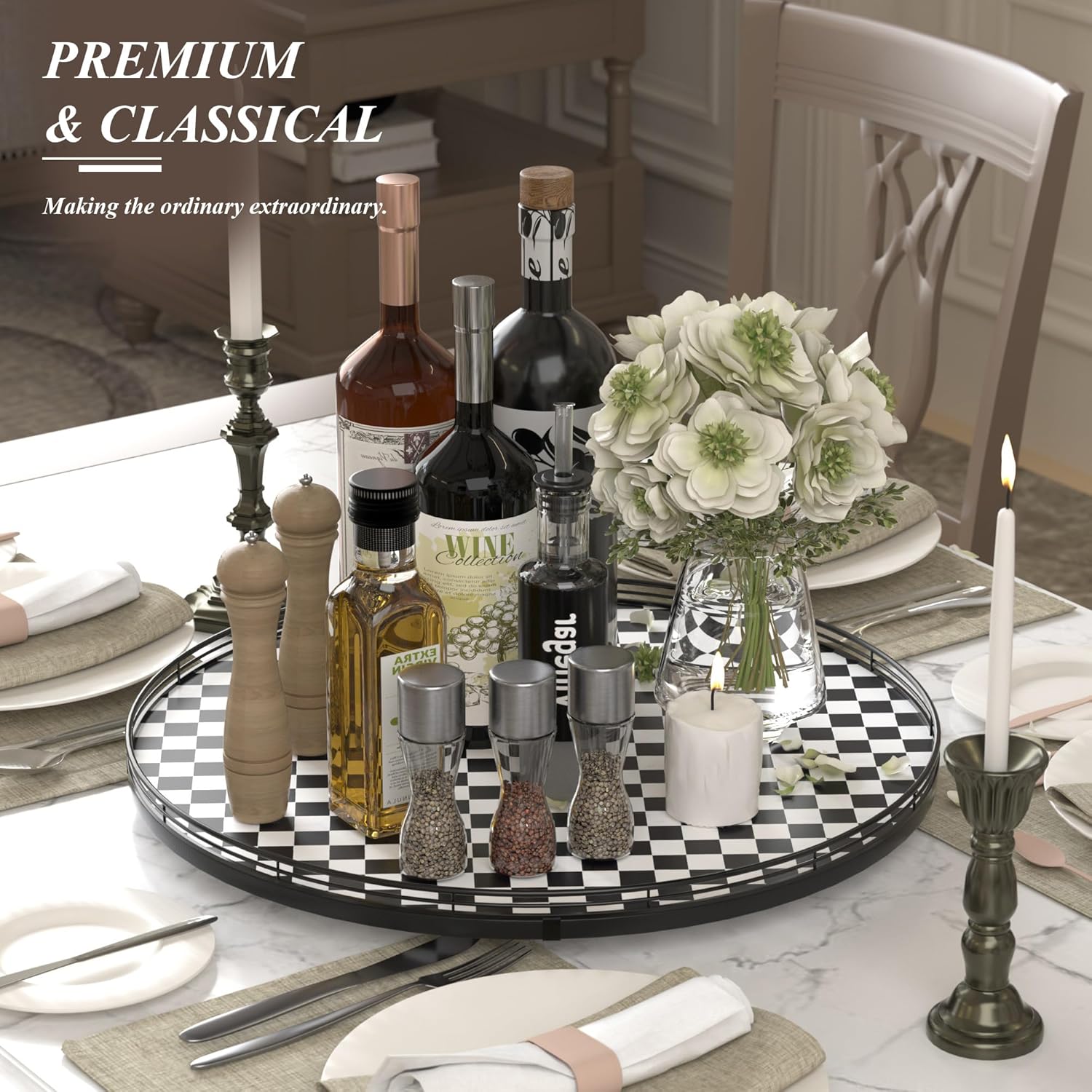 - CLASSIC BLACK AND WHITE CHECKERED DESIGN: A stylish black and white kitchen decoration plate with a sturdy iron frame, seamlessly blending with your black and white kitchen things to elevate your home decor. Perfect as a large decorative lazy Susan, a kitchen table centerpiece, or a table kitchen caddy, bringing both function and charm to your tabletop.