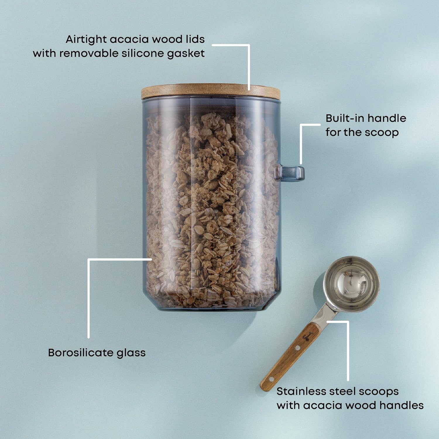 - 3 GLASS CANISTERS WITH SCOOPS: Upgrade your kitchen storage with these 32oz borosilicate glass food storage containers! Each container features a built-in handle to conveniently hold its spoon on the side, making it easy to scoop 1 tbsp of everything from morning coffee beans to evening bath salts.