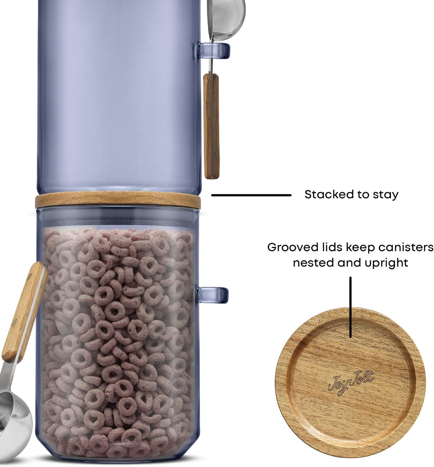 JoyJolt Holden 32oz Stackable Glass Storage Containers with Lids and Scoops, Airtight Food Canister Set of 3 w/Acacia Wood Lids, Round Stacking Pantry and Kitchen Containers w/Scoop | Smoke Blue