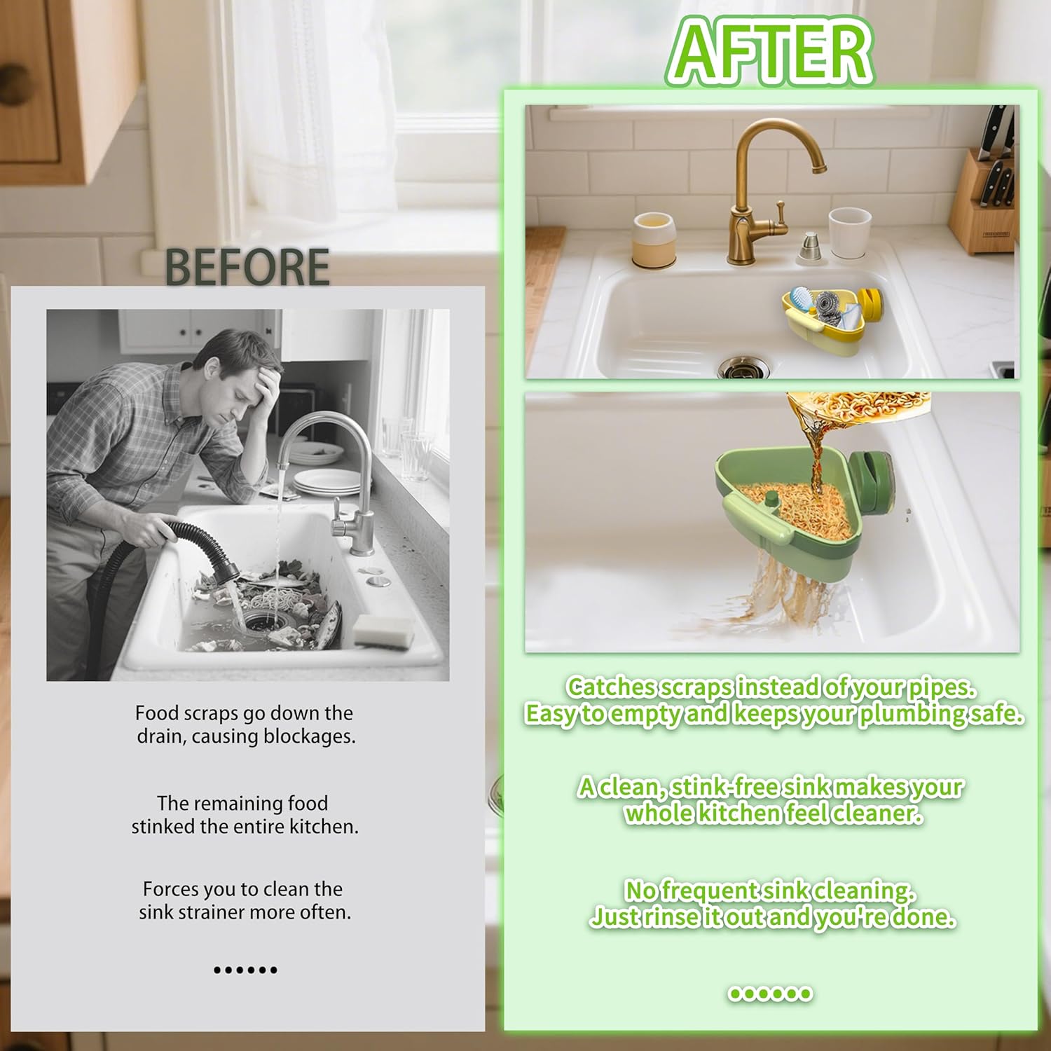 - 2-in-1 Strainer & Sponge Holder: Not just a strainer, it also holds your sponge, brush, or scrubber right by the faucet. Everything stays organized and within reach—no more clutter around the sin.
