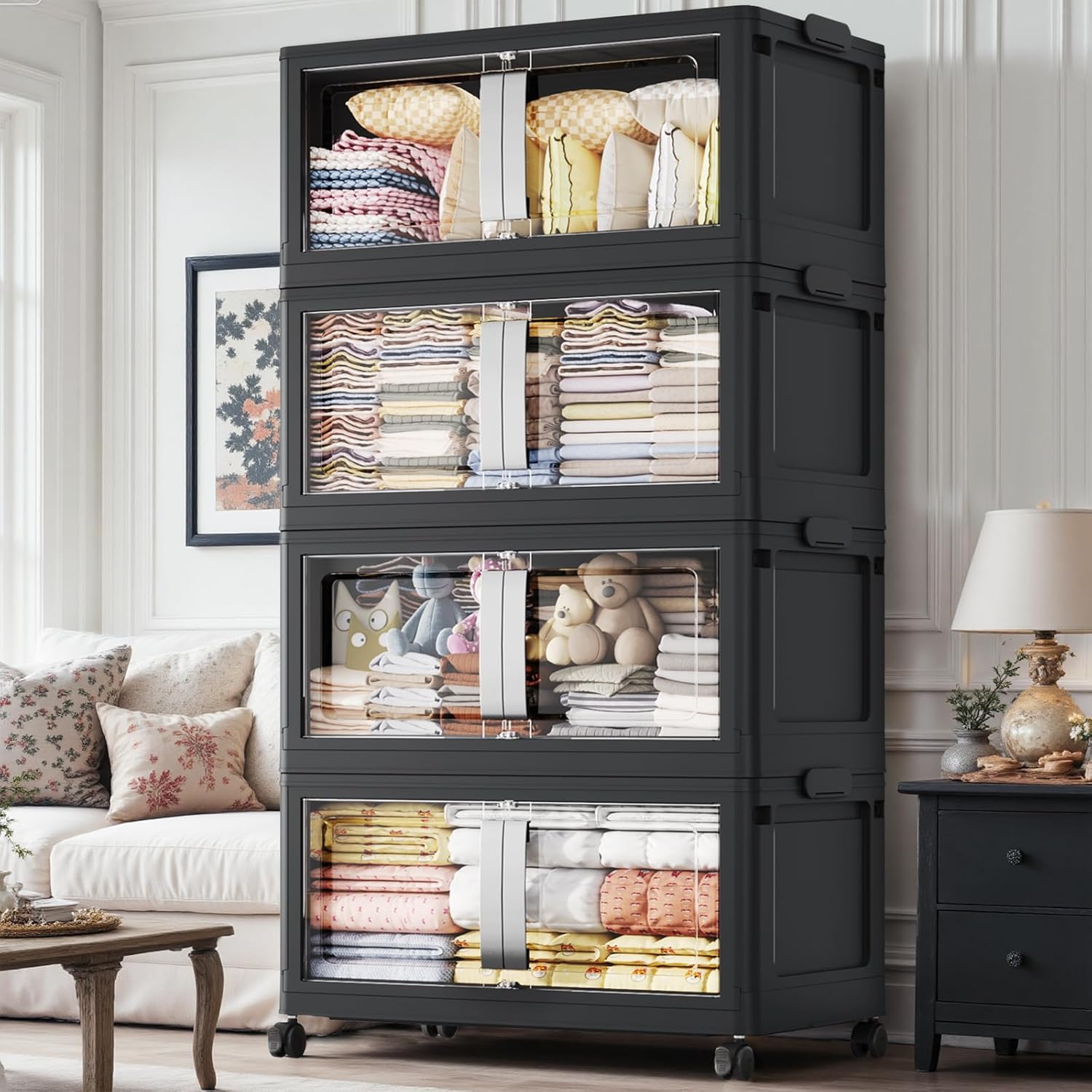 640QT Stackable Storage Bins with Lids, 160Gal Extra Large Collapsible Storage Box with Wheel, Plastic Storages with Clear Door Open Front for Home Bedroom Garage, Black-4pack