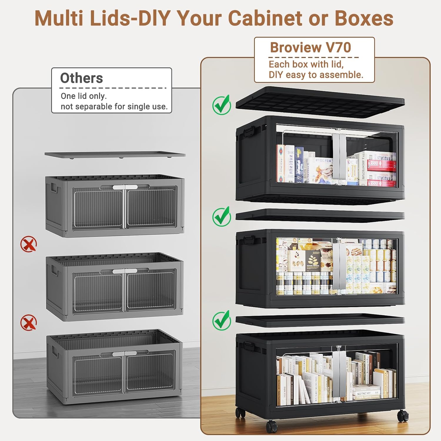 - 【Use Individually & Stack to Save Space】Each heavy-duty storage bin comes with its own lid, allowing you to use them individually or stack multiple plastic drawers(saves 50%+ space). The Broview V70 stackable storage bins with lids can fold flat to 3.55" thickness for off-season storage. Ideal for closets, dorms, bedroom, garage- keeps items organized