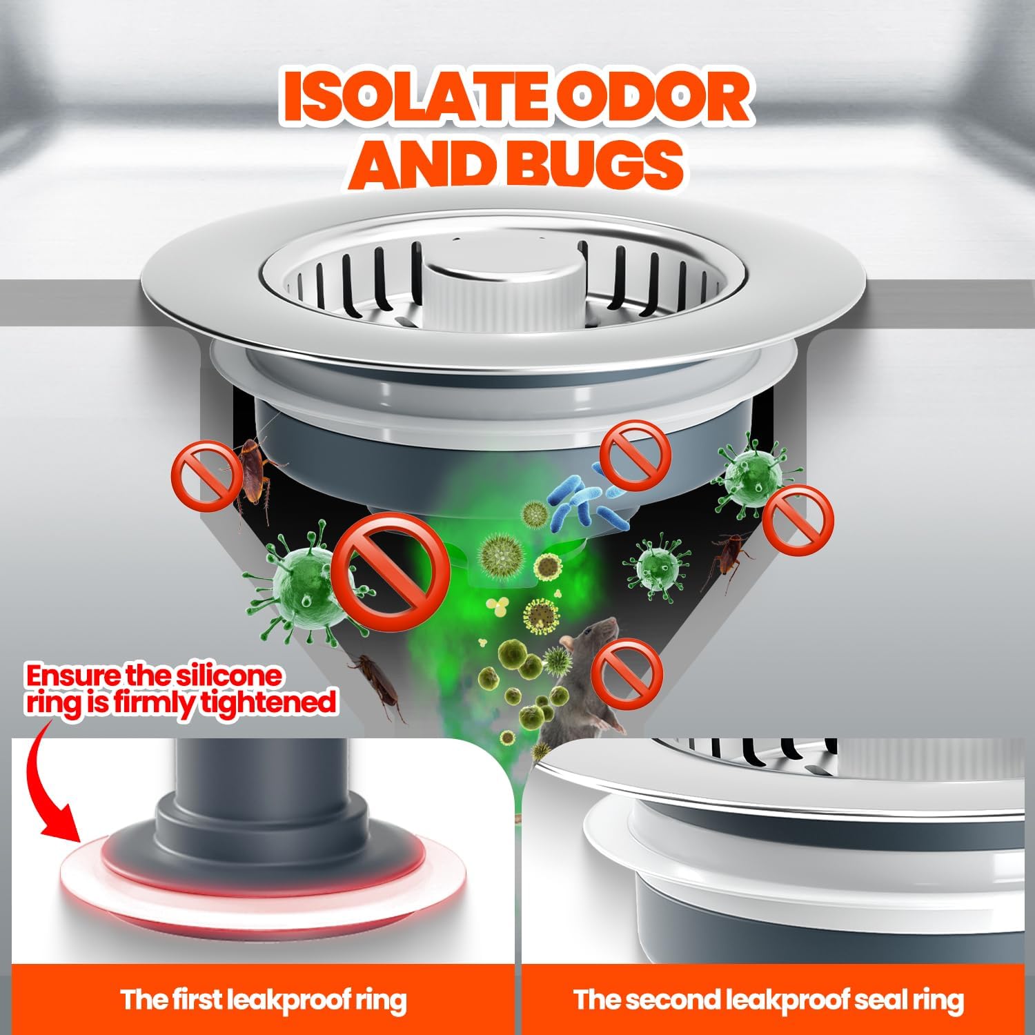 - Innovative 2-Pack 3-in-1 Design:Enjoy double the convenience with this 2-pack sink drain set. Each unit works as a stopper, strainer, and odor blocker. Just press to seal water, allow smooth draining, or block food waste to prevent clogs.