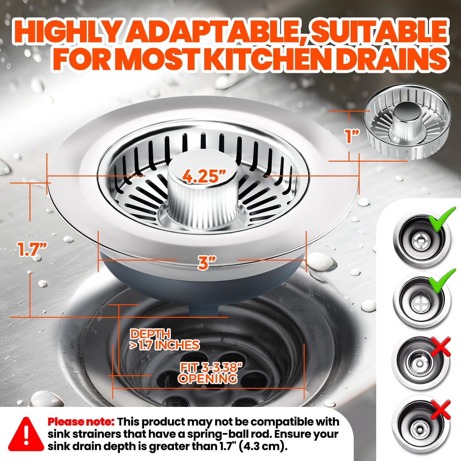 - Perfect Fit for Standard Sink Drains:Fits most US-standard 3-1/2" sink openings (3"–3.38"), with a height of 1.7". Includes a 1" deep food basket for effective filtering. Please check your sink size before purchase.