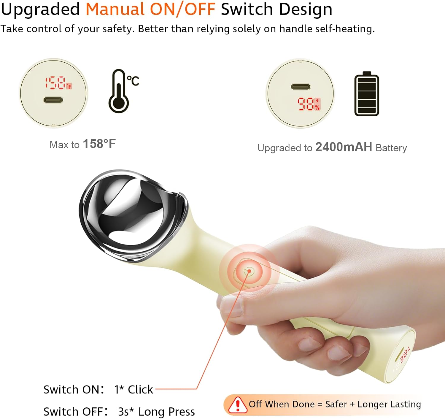 - 【Innovative Heated Ice Cream Scoop(2025 Newest Gen 3.0)】Designing the upgraded Manual ON/OFF Switch,the ice cream scooper heats up to Max to 158°F as you power on it by one click.You could have more control over when the icecream scoop is activated.Moreover,the customized stable stand stays the heated ice cream scoop put,not tip over to damage anything.The built-in LED display shows the real-time temperature and battery level, so you always know it's ready for action without any guesswork.